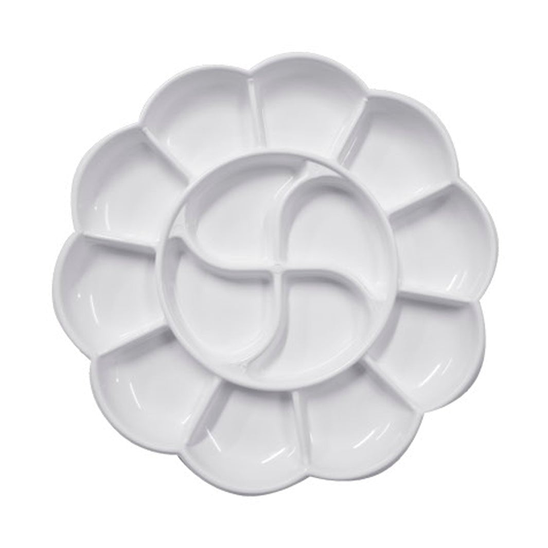 Este godete tiene forma de flor, mide 19 x 19 x 1.5 cm y trae 14 cavidades. Utilízalo con acuarela, gouache, acrílico y tintas.