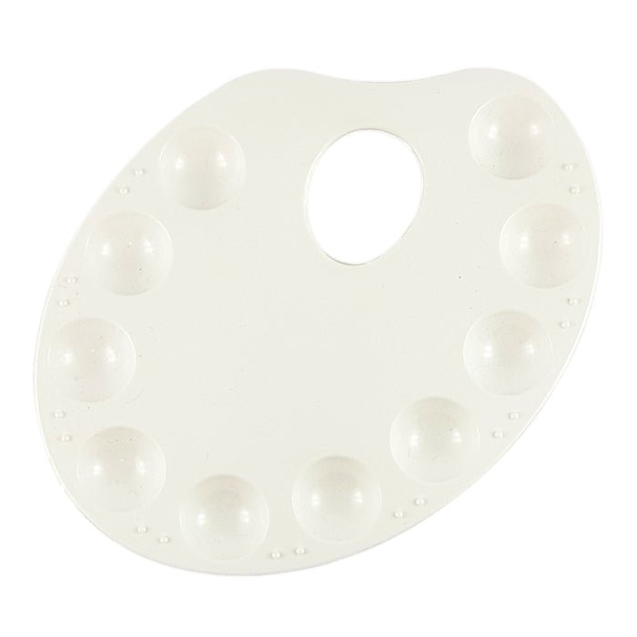 Esta paleta de plástico remigído tiene 10 cavidades redondas de 3 cm de diámetro y 1.5 cm de profundidad, más un agujero en la parte inferior para colocar el dedo pulgar.