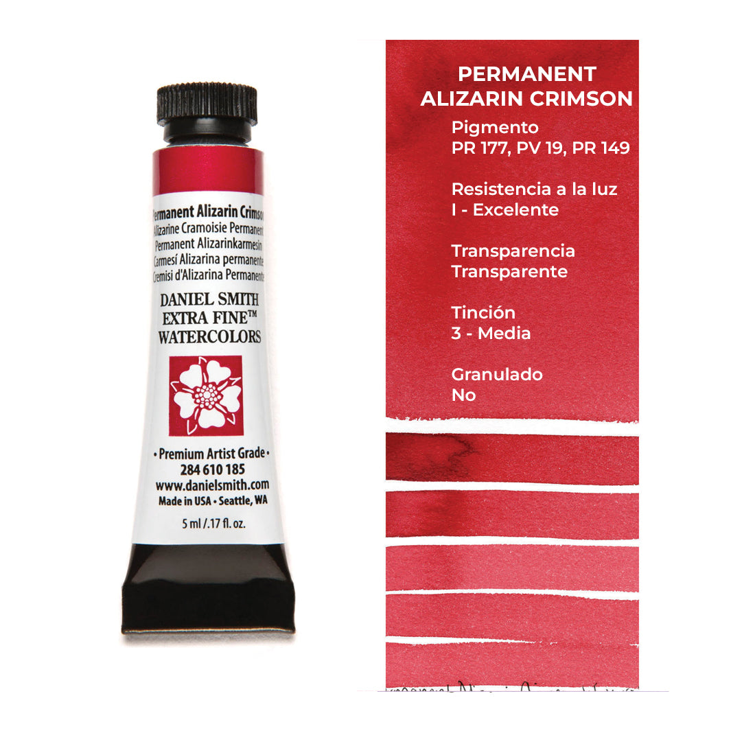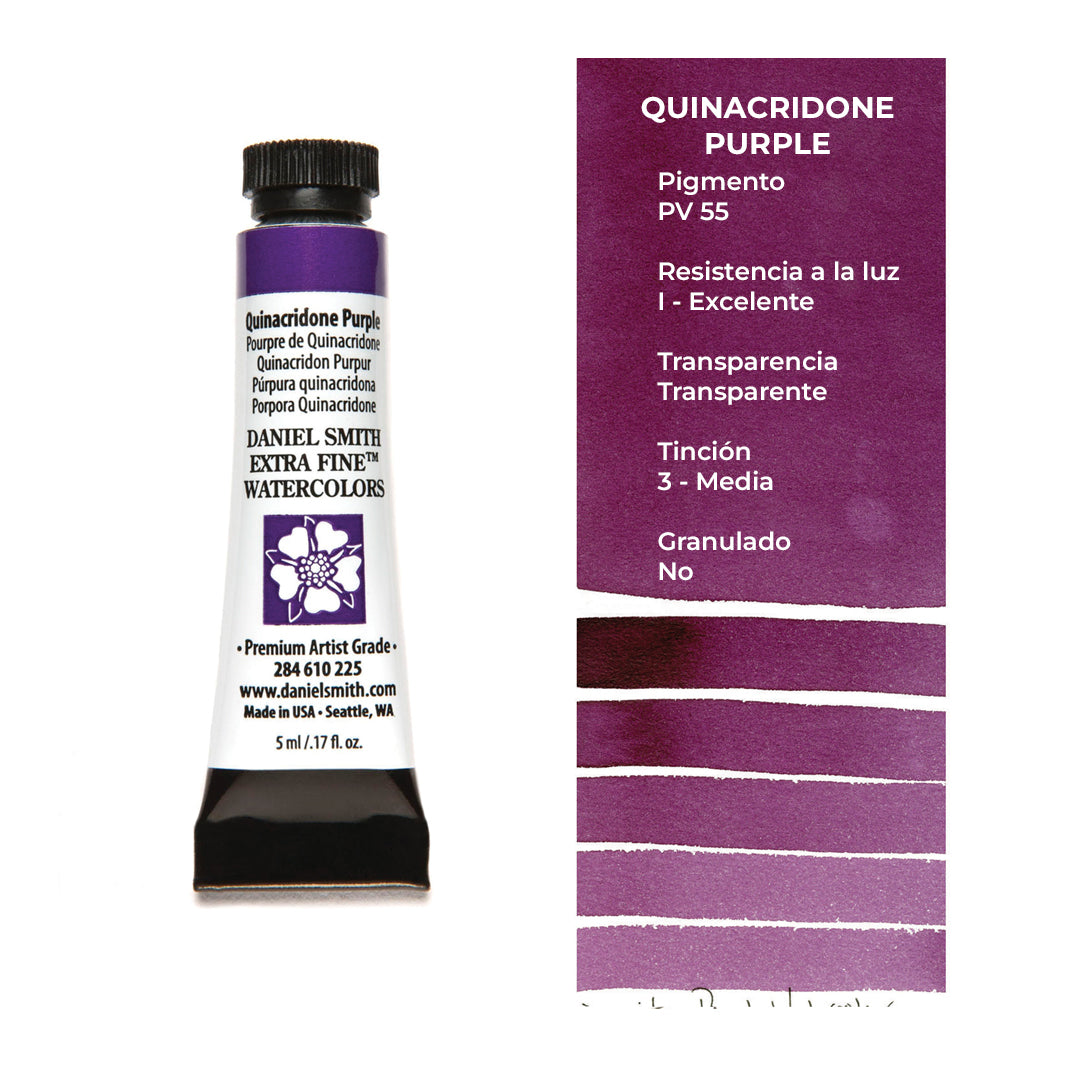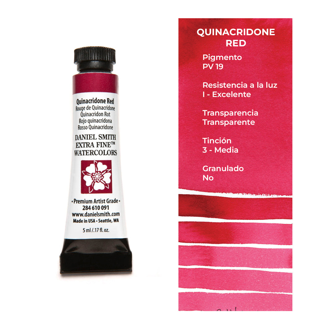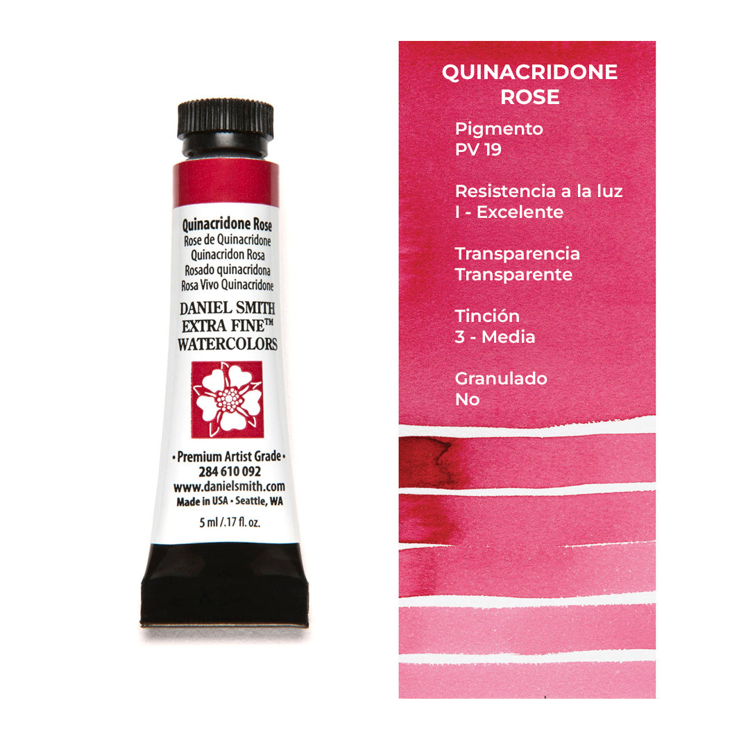 Cada tubo individual de acuarela Daniel Smith trae 5 ml de pintura; las tenemos disponibles en 100 colores, incluyendo una selección de cadmios y cobaltos verdaderos, los populares Opera Pink y Neutral Tint, y los magníficos quinacridonas que solo Daniel Smith ofrece.