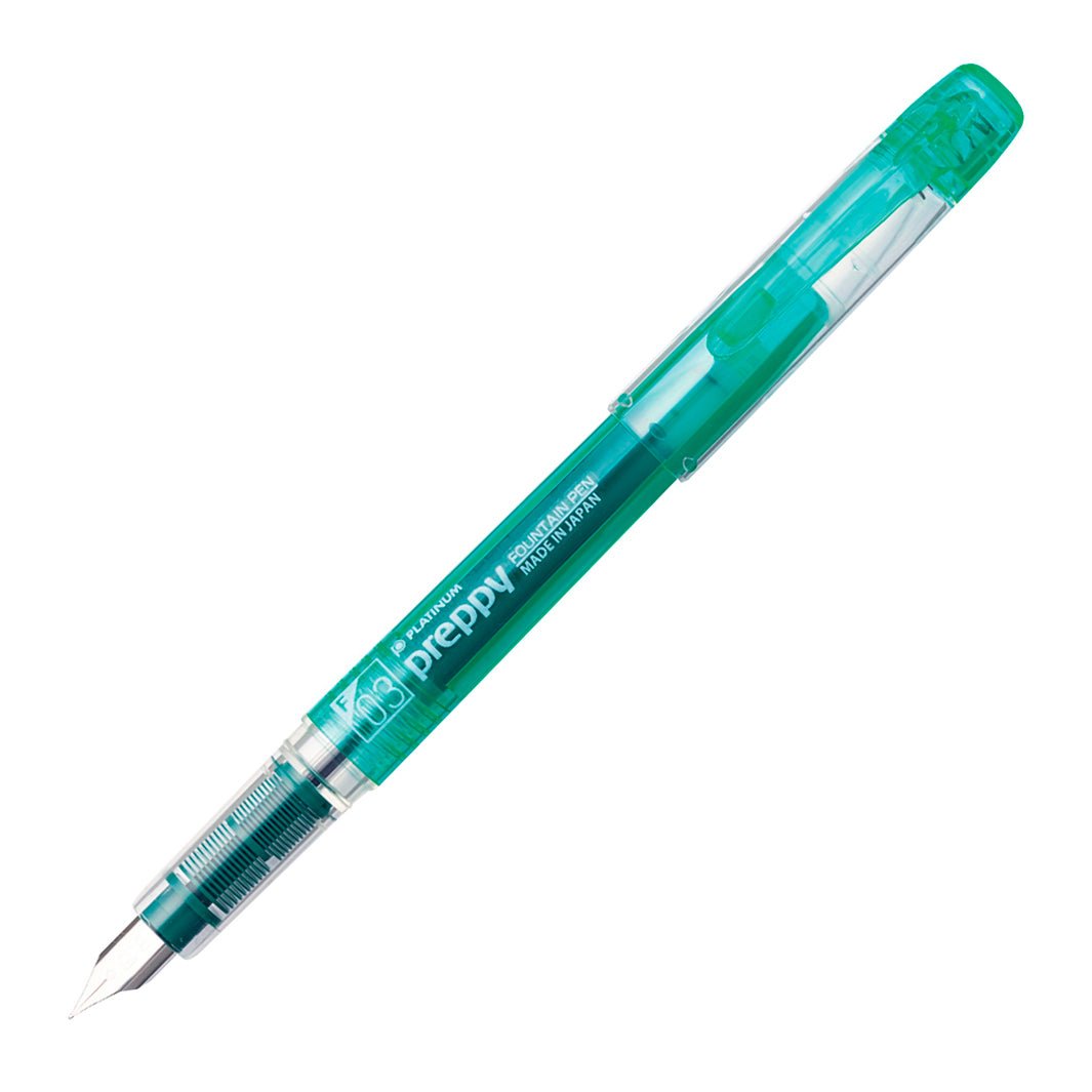 La Platinum Preppy F está disponible en 7 colores de cuerpo; cada una trae un cartucho de tinta del mismo color del barril.